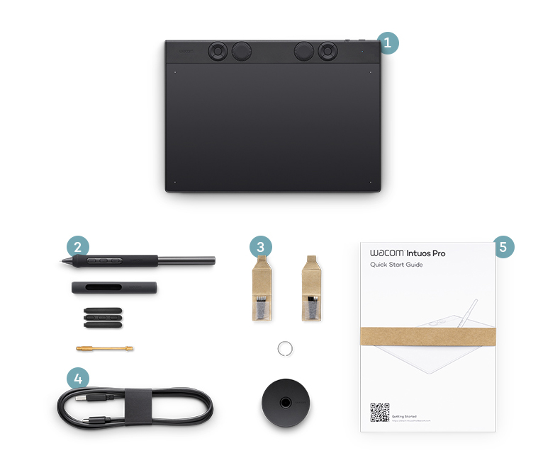 Bảng vẽ Intuos Pro (2025) đi kèm với bút Wacom Pro Pen 3, đế cắm bút và 04 ngòi tiêu chuẩn, 03 ngòi nỉ, 02 ngòi cao su mới.