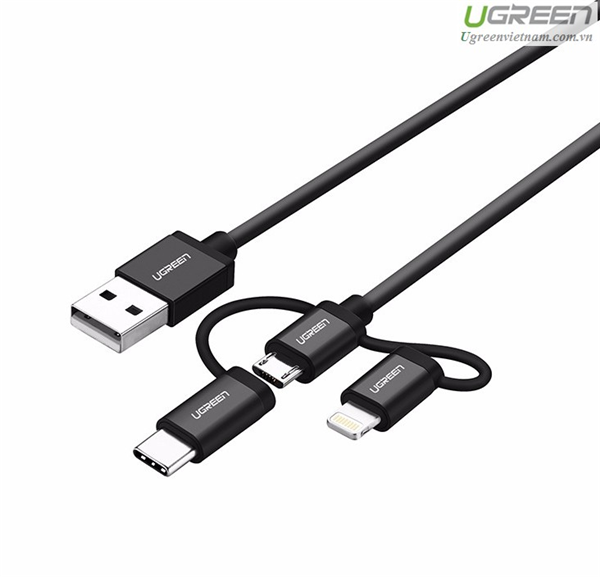 - Cáp sạc điện thoại đa năng 3 tính năng trong một sản phẩm Ugreen 30784. Hỗ trợ 3 chuẩn cáp Type C và Micro USB và lightning, sử dụng sạc cho hầu kết các điện thoại, máy tính bảng trên thị trường hiện nay.