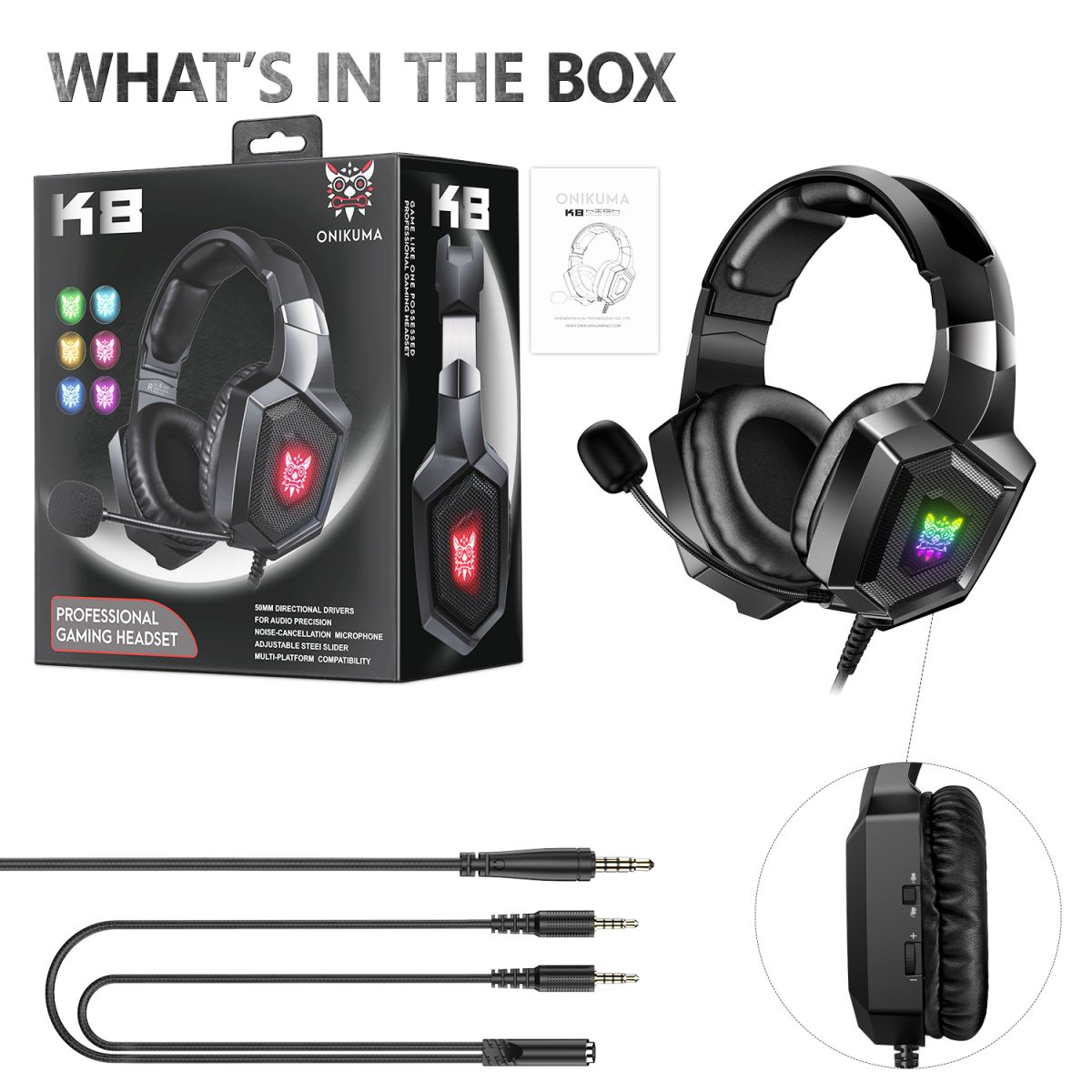 SẢN PHẨM TAI NGHE CHƠI GAME CHUYÊN NGHIỆP ONIKUMA K8 BAO GỒM