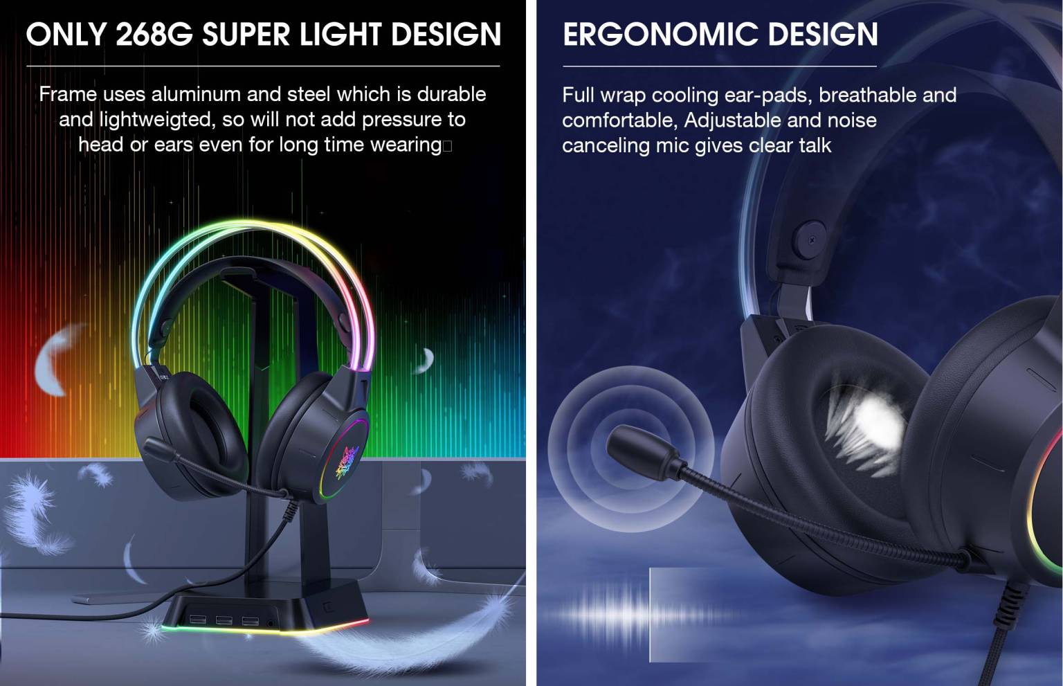 Thiết kế công thái học & chất liệu cao cấp làm cho đầu và tai của bạn thoải mái sau nhiều giờ chơi game.