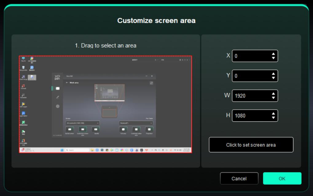 - Nhấp để thiết lập khu vực màn hình: Nhấp vào vị trí góc trên bên trái và vị trí góc dưới bên phải để chọn trên màn hình.