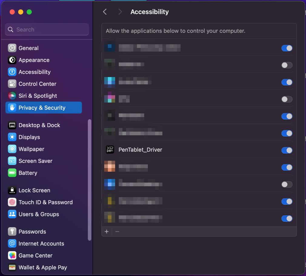 Giải nén tập tin, chạy tập tin "dmg" và làm theo các hướng dẫn để hoàn tất cài đặt. Đi đến Cài Đặt Hệ Thống -> Quyền Riêng Tư & Bảo Mật -> Khả Năng Truy Cập; Không dây: Cài Đặt Hệ Thống -> Quyền Riêng Tư & Bảo Mật -> Khả Năng Truy Cập & Bluetooth, vui lòng đảm bảo rằng tùy chọn PenTabletDriver được chọn; Nếu không, thiết bị và trình điều khiển có thể không hoạt động đúng cách.